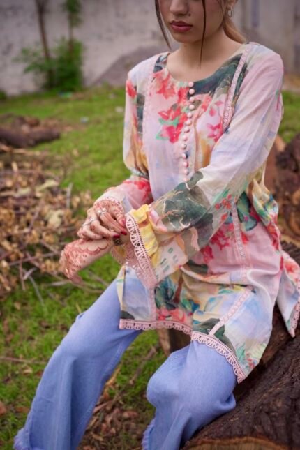 A light floral print tunic with soft pink trim – graceful, breezy, and effortlessly pretty 🌿🌸